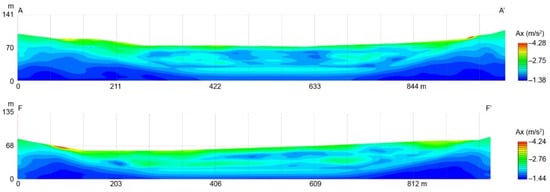 In order to quantify the seismic local response in the Poggio Cancelli valley area, two-dimensional numerical modeling along the seven defined engineering-geological cross-sections was performed by LSR 2D software version 4.4.0; this computation code, produced by STACEC Srl and licensed at the Department of Earth Sciences of Sapienza University of Rome, was recently used for several local seismic response studies to simulate two-dimensional seismic effects [,]. In fact, LSR 2D allows to perform two-dimensional modeling of seismic motion propagation, through an equivalent linear analysis, to finite elements in the time domain, in total stresses, applying a viscoelastic rheological behavior of Kelvin–Voigt. Specifically, the following procedure was adopted: assignation of weight for unit volume (γn), shear-wave velocity (Vs), and dynamic parameters (i.e., shear stiffness and damping degradation curves) for each layers in all engineering-geological sections; discretization of the model (cross-section) in quadrilateral meshes with 2-m resolution grid; application of free-field conditions (i.e., damping conditions in the X and Z) on the lateral borders and a kinematic constraint on the vertical motion at the base of the domain (placed at a minimum depth about 50 m from the ground level) inside the infinite half-space representative of the seismic bedrock from which the propagation of the input occurs up to contact with the filling soils of the valley (soft soil with viscoplastic behavior).