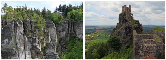 In the 1930s, the first areas of sandstone rocks received their nature protection [36]. In addition, Bohemian Paradise was the first region in former Czechoslovakia to receive the status of a Protected Landscape Area in 1955 [36], which is a category of a large-scale protected area for the cultural landscape (for the unspoiled natural landscape it is the National Park). Finally, in 2005, the newly established Bohemian Paradise Geopark became the 25th member of the European Geoparks Network and in 2015 the first and so far the only Czech geopark in the UNESCO network [37]. An orientation map showing the location of the geopark is shown in Figure 1, examples of two types of the most visited types of sites—rock formations and cultural monuments—are in Figure 2.