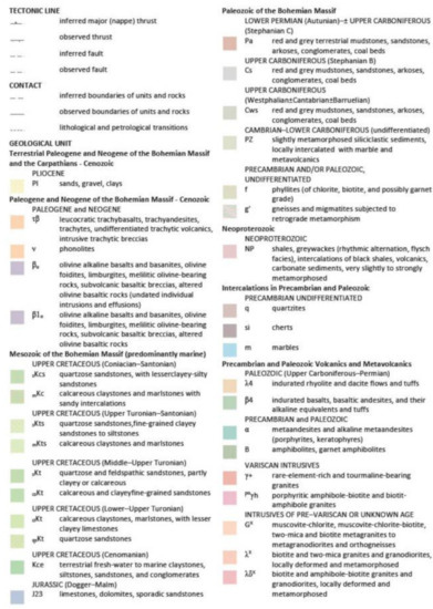 - Chab, J.; Stranik, Z.; Elias, M. Geological Map of the Czech Republic 1:500,000; Czech Geological Survey: Praha, Czech Republic, 2007; ISBN 9788070756997. [Google Scholar]