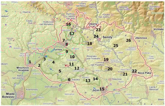 Location of data collection points within the Bohemian Paradise UNESCO Global Geopark. Description: 1—Mnichovo Hradiště, 2—Valečov, 3—Krásná vyhlídka, 4—Příhrazy, 5—Kost, 6—Sobotka, 7—Hrubý Rohozec, 8—Turnov, 9—Valdštejn, 10—Hrubá Skála, 11—Nebákov, 12—Trosky, 13—Prachovské skály, 14—Jinonice, 15—Jičín, 16—Frýdštejn, 17—Malá Skála, 18—Kozákov, 19—Lomnice, 20—Tábor, 21—Kumburk, 22—Nová Paka, 23—Bozkov, 24—Semily, 25—Košťálov, 26—Jilemnice.