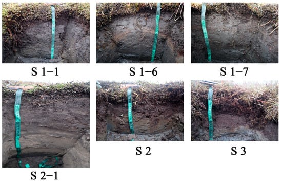 Flooded areas, due to the lack of dense vegetation cover, warm up more in summer, and processes of humification of organic matter are more active [,]. Due to better warming, the thickness of these soils can reach up to 1 m. Annually, the processes of re-deposition of material lead to the alternation of soil horizons. These facts contribute to the migration of water along the profile, therefore, the cryogenic processes and cryogenic mass exchange are less noticeable in the soil.