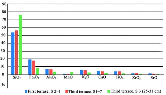 It can be seen from the obtained figure that on the island of Sardakh there was an active accumulation of quartz under the influence of the river, as well as weathering processes of primary and secondary minerals in time. During seasonal freezing/thawing processes, minerals are destroyed and quartz particles accumulate. We can also observe a decrease in the content of various oxides (iron, aluminum, potassium, calcium, titanium) in the studied soils. This fact was also noted in the area of the Nadym river basin, where the content of quartz particles increased with age and depth, while the content of oxides (iron, aluminum, potassium, calcium, titanium) decreased []. This tendency can be traced from the youngest soils to the oldest from the obtained sample. According to the cryogenic processes, in the permafrost zone, oxides in acidic conditions exhibit active migration ability and, during cryogenic mass exchange, can accumulate in permafrost soils.