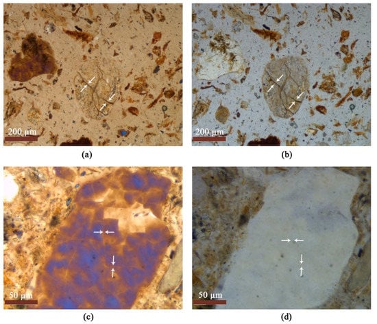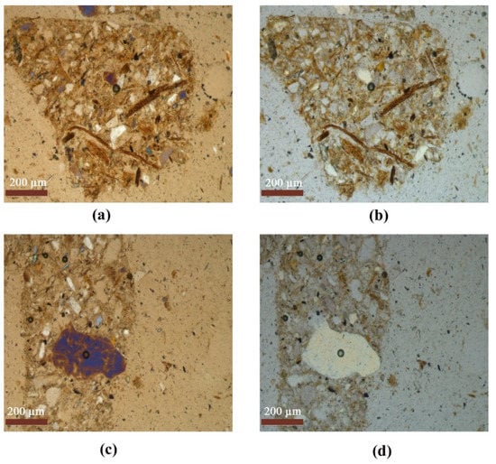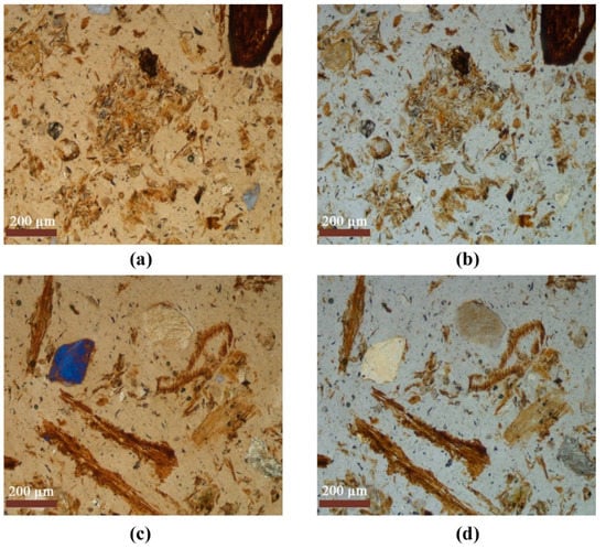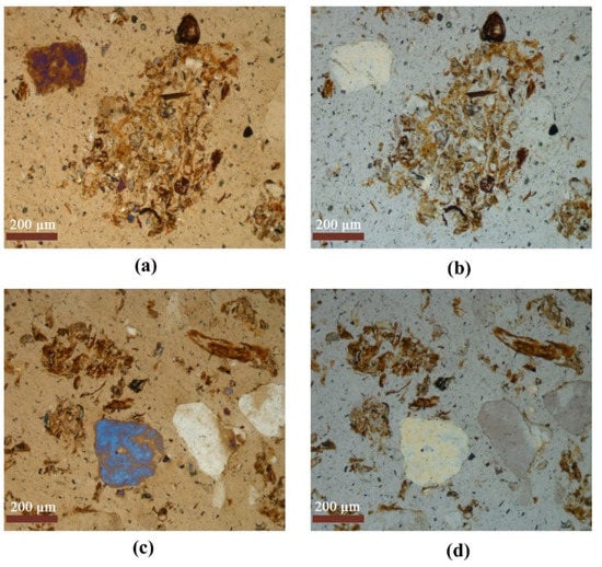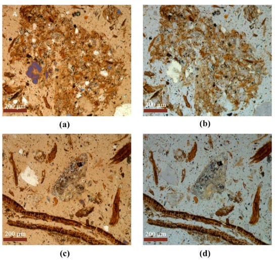 Organ residues of study soils (S 1−6). (a,c) Plane polarized light; (b,d) crossed polarized light.