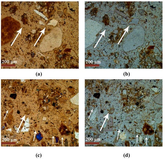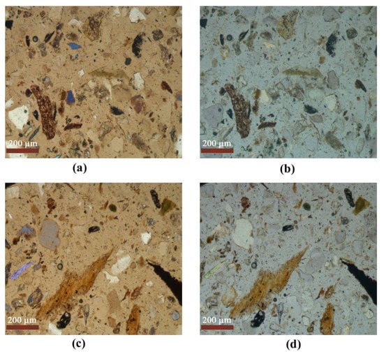 Poorly sorted mineral materials (S 1−7). (a,c) Plane polarized light; (b,d) crossed polarized light.