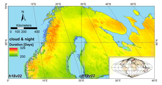 Snow coverage in this study is derived from the MODerate resolution Imaging Spectrometer (MODIS). The daily snow cover product MOD10A1 (Terra) and MYD10A1 (Aqua) from the version 6 [35] are derived from the normalized difference snow index (NDSI) and made available free of charge by the National Snow & Ice Data Center (https://nsidc.org/data/MOD10A1, https://nsidc.org/data/MYD10A1, (accessed on 10 October 2020). Since operational data from MODIS Terra are available since 2000-02-24 and from MODIS Aqua since 2002-07-04, we examined the last 20 hydrological years (2001 to 2020). We define the hydrological year in the northern hemisphere beginning with 1 September of the previous year and ending on 31 August of the current year. This results in a total of 7305 MODIS Terra scenes and 6634 MODIS Aqua scenes. Each of the square MOD10A1/MYD10A1 tiles has a side length of 1200 km (this corresponds to approx. 10°) and is in the equal-area sinusoidal projection [35]. Our investigation area is covered by the tiles h18v02 and h19v02. The adverse effects of clouds and the polar night in these high latitudes make effective interpolation of the data essential (Figure 1).