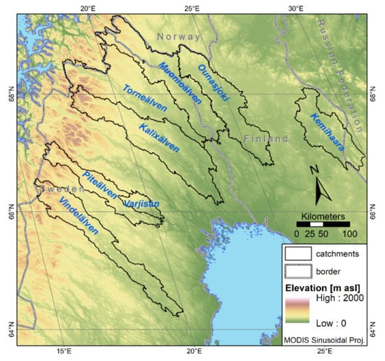 In this investigation we analyze the spatio-temporal patterns in snow cover and runoff in the Sápmi region for the period 2001–2020 and the factors affecting discharge extremes. This period exhibits high variability in the timing of the onset, longevity, and end of the snow season. Since snow deposits are the water reservoirs for nival rivers in winter, our main focus is on analyzing the annual snow cover: remote sensing methods are suitable for this task [16]. Statistical analysis of upland catchment data shows that discharge is most often correlated with temperature but not precipitation, even accounting for lags. As a proxy for the water reservoir stored in the snowpack we use snow-covered area estimates from MODerate resolution Imaging Spectroradiometer (MODIS) satellite data. The snow data derived from MODIS has a long history of studying the seasonal changes in snow cover, and has applications in the Himalayas [17,18], in East Asia [19,20], Central Asia [21,22,23], North America [24,25], North Africa [26,27], and in Europe [28,29,30]. However, the use of optical data to determine snow cover requires methods for interpolation in the case of cloud cover and—at higher latitudes—missing data due to the polar night. To solve this problem, the DLR’s Global SnowPack processor was used in this study [31]. To study the effects of the extraordinary snow conditions in northern Fenno-Scandia, rivers were chosen that were not regulated by dams for flood protection or hydropower generation. In northern Sweden, the rivers Torneälven, Kalixälven, Piteälven, and Vindelälven (a tributary of the Umeälven) were chosen. As national rivers, they are not influenced by hydropower exploitation. In Finnish Lapland, the Kemijoki is the largest river alongside the unregulated border river with Sweden (the Muoinoälven, which flows into the Torneälven). Most of the Kemijoki river is heavily regulated, so only the Ounasjoki tributary (which flows into the Kemijoki in Rovaniemi) and the Kemihaara (upper reaches of the Kemijoki watershed in the northwestern catchment) area are selected.