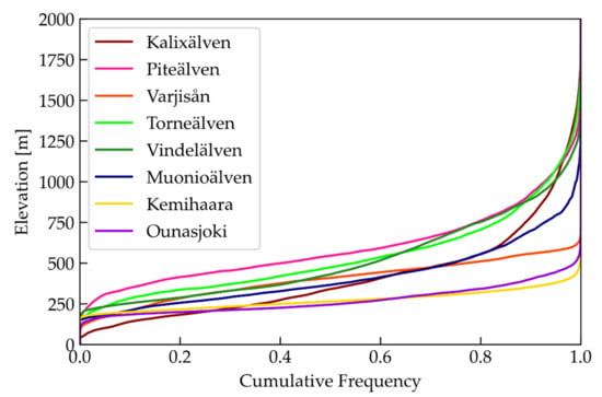 Figure 3 shows the elevation distributions (hypsometric curves) of all selected basins. While the rivers Ounasjoki, Kemihaara, and Varjisån are almost exclusively below 500 m, the catchment areas of the others have a pronounced topographical gradient.