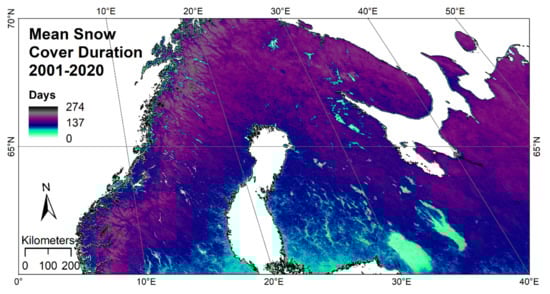 Figure 4 shows the mean snow cover duration (SCD) for the hydrological years 2001 to 2020. Snow cover is most persistent in the Scandinavian Mountains, Sápmi, and the Kola Peninsula. The lakes are also easily recognizable due to their relatively small number of snow-covered days. This is due to the fact that they still have an open water surface next to snow-covered land, or they are covered with lake ice (without snow cover), which forms a separate class in the MODIS data.