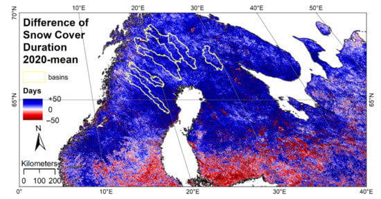 Figure 5 shows the deviation of the hydrological year 2020 compared to the long-term mean (2001–2019). In most parts of the region, SCD was up to 50 days longer compared to the mean duration. A closer look at the Early Season SCD the (SCDES) and Late Season (SCDLS) revealed that snow coverage both started earlier and lasted longer this year. The pattern is particularly marked in the densely forested lower Umeälven and Piteälven catchments and other heavily forested locations in northern Fenno-Scandia.