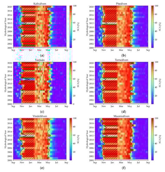 Figure 6 shows the individual snow coverages (weekly mean) for each catchment area. Additionally, SCDES (solid line) and SCDLS (dashed line), both calculated according to Equations (4) and (5), are shown. What is initially noticeable is the long range between November and January in which values stagnate—this is caused by the polar night (hashed areas in Figure 6). This is the time when the greatest uncertainties regarding snow cover prevail, as the data are interpolated over very long periods of time. Since there is still no snow cover, especially in early winter, this underestimation will be continued until data are available after the polar night. The year 2012 shows very little snow cover in all catchment areas until the end of the polar night, the snow accumulation started extremely late this year. Also, years with very long snow cover are recognizable: The hydrological year 2020 shows an extraordinarily long snow cover in all catchment areas. The year 2010 was a little less pronounced, but still exceptionally snowy. However, the floods of 2018 did not show any extremes in terms of snow cover, the causes here are probably due to hydrometeorological factors.