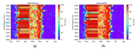 Weekly mean of snow coverage for the hydrologic years 2001 to 2020 for (a) Kalixälven, (b) Piteälven, (c) Varjisån, (d) Torneälven, (e) Vindelälven, (f) Muonioälven, (g) Kemihaara and (h) Ounasjoki. The hatched area shows the polar night (depending on the catchment area between weeks 10 and 22), the solid line shows the calculated SCDES, the dashed line the time of the SCDLS.