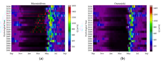Discharge plots of (a) Muonioälven and (b) Ounasjoki. The upward pointing triangle indicates the maximum spring flood, the downward pointing the minimum.