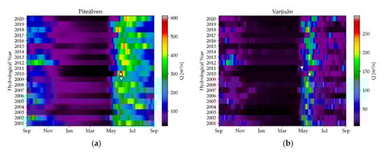 Discharge plots of (a) Piteälven and (b) Varjisån. The upward pointing triangle indicates the maximum spring flood, the downward pointing the minimum.