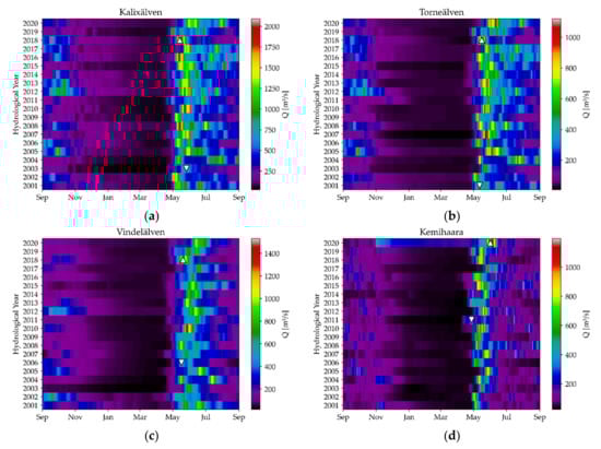 Discharge plots of (a) Kalixälven, (b) Torneälven, (c) Vindelälven, and (d) Kemihaara. The upward pointing triangle indicates the maximum spring flood, the downward pointing the minimum.