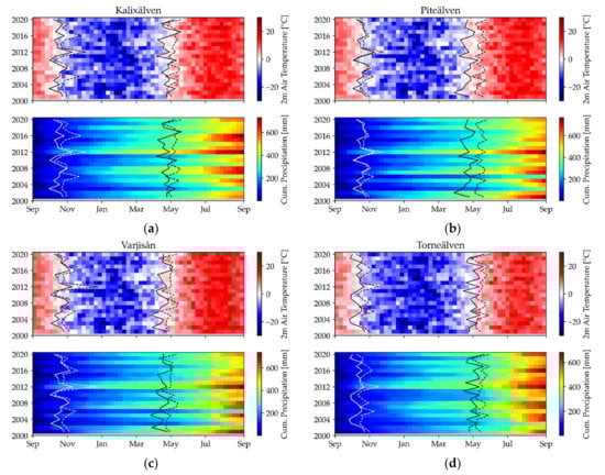 Figure 10 and Figure 11 show the weekly mean air temperatures and the summed weekly precipitation totals for the hydrological years 2001 to 2020. The solid vertical lines show the SCS and SCM derived from air temperature, the dashed lines SCDES and SCDLS from GSP, respectively. At Kalixälven (Figure 10a), for example, the lowest runoff peak in 2003 was due to the exceptionally low snow precipitation. In 2016, there was an extraordinary amount of snow precipitation, but the air temperature development in spring was more moderate, so that no record floods occurred. For Piteälven (Figure 10b) and Varjisån (Figure 10c), the highest runoff occurred in 2010, where the air temperatures were relatively low during winter enabling a large accumulation of snow. The years 2003 and 2006 were the years with the lowest snow precipitation and consequently little runoff. For Torneälven (Figure 10d) the lowest runoff peak occurred in 2001, the precipitation was average this year, snow accumulation started late and ended early. The year 2018 (The largest spring runoff of the Torneälven) was not exceptional in terms of precipitation; however, there was a sharp rise in weekly mean temperature at the end of the snow season.