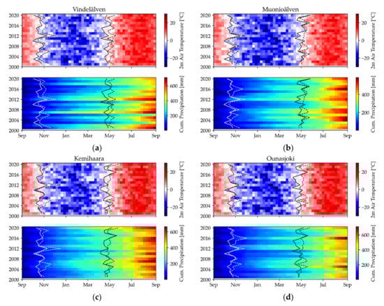 Weekly mean air temperature and weekly sum of precipitation for (a) Vindelälven, (b) Mounioälven, (c) Kemihaara, and (d) Ounasjoki. The earlier lines show the snow cover start, the later the beginning of snowmelt. Solid lines are derived from the satellite product; dashed are derived from the air temperature.
