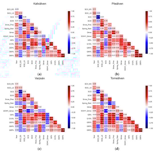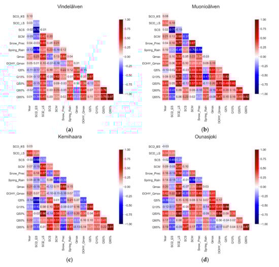 Correlation matrices for the timing measures of (a) Kalixälven, (b) Piteälven, (c) Varjisån, and (d) Torneälven.