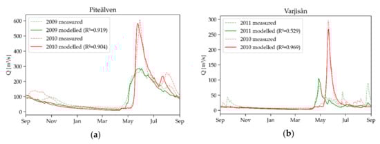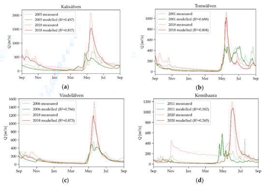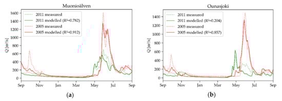 The duration of the spring runoff for 2005 was well determined for both the Mounioälven (Figure 14a) and the Ounasjoki (Figure 14b). The discharge peak was a bit underestimated for both as was the smaller earlier autumn discharge peak. For the minimum discharge in 2011, the spring peak flow itself was better modeled for Ounasjoki, although the coefficient of determination () was very low.
