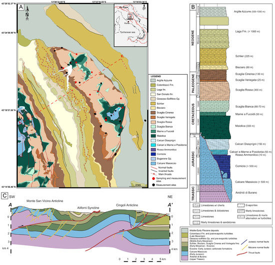 (A) Location and simplified geological map of the Cingoli Anticline. Red points represent the sampling sites for sedimentary stylolites analysis, and black points represent the measurement sites. (B) Stratigraphic column, not to scale, of the Umbria-Marche area, with thicknesses valid for the Cingoli Anticline area (modified from [61]). (C) SW-NE geological cross section through the northern part of the Cingoli Anticline [63].