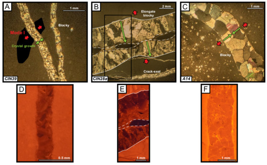 Observation of the different types of fractures in optical microscopy. (A) N-S fractures, (B) N045 fractures and (C) N135-160 fractures. Textures and shifts in the matrix were characterized, in order to verify the deformation mode, based on the classification of [130]. Red arrows represent the direction of the opening (mode I), and green arrows the direction of calcite crystal growth. (D–F) observation of these different sets in cathodoluminescence, indicating a single crystallization phase, synchronous with the mode I opening.