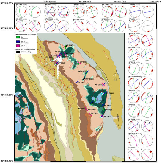 Three major sets of fractures were discriminated on the basis of their average orientation (Figure 3 and Figure 4A,B) whereas their chronological sequence was established through abutment and crosscutting relationships at different scales (from outcrop to thin section):