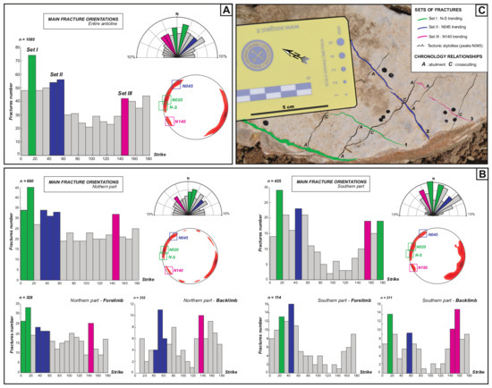 Main fractures orientations (after unfolding) plotted on histograms, stereograms and rose diagrams for (A) the whole anticline and (B) northern and southern parts of the anticline, discriminating forelimb and backlimb measurements. Three major sets of fractures discriminated according these orientations are represented with their specific color (green: set I, blue: set II, pink: set III). (C) Chronological relationships between fractures and stylolites (i.e., abutment and crosscutting), observed at mesoscopic scale.