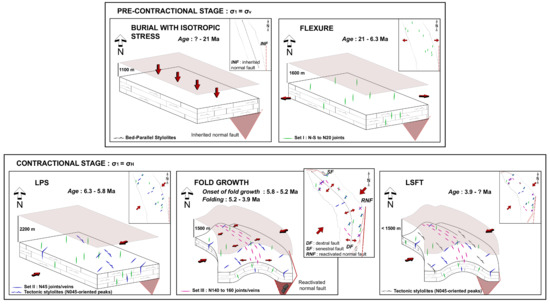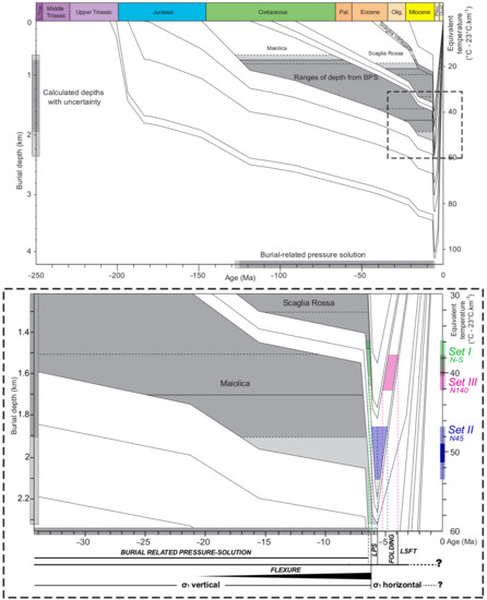 The reconstruction of the burial-deformation history of sedimentary rocks is a complex issue but an essential exercise to understand the tectonic and sedimentary history in fold-and-thrust belts and foreland basins, with numerous implications spanning from the evolution of the fluid-flow system and associated resources to the understanding of the long-term behavior of the upper crust [1,2,3,4,5,6,7]. Mesostructures observed in fold-and-thrust belts and related forelands, such as faults, veins, and stylolites provide essential information for understanding the deformation pattern [8]. Numerous studies have indeed linked the development of fractures to the large-scale long-term folding history and geometry, either through a descriptive field-based approach [9,10,11], paleostrain and paleostress reconstructions [12,13,14,15,16,17], mechanical simulation (e.g., [18,19]), or through geochemical approaches (e.g., [20]). Besides, studies of distributed subseismic fractures demonstrated that mesostructures are markers of the local deformation sequences and provide access to the evolution of the associated paleostresses [8,9,10,15,21,22,23,24,25,26,27,28,29,30,31,32,33,34,35,36]. When it comes to the burial history, however, the depth-time paths are reconstructed from temperature-dependent proxies, such as organic matter thermal maturity, temperature-dependent clay minerals (e.g., [37,38,39]), fluid inclusion microthermometry, or low temperature thermochronology (apatite fission tracks, U-Th/He on apatite crystals [40,41,42,43,44,45,46]). All these methods rely on the occurrence of specific features (organic matter, fluid inclusions, specific minerals like zircons, or Ar-rich clays) and return only partial information (e.g., maximum temperature, timing of reaching closure temperature…) while requiring assumptions about the past geothermal gradient. The latter is often argued over in fold-and-thrust belts and foreland basins where uplift and erosion are common events, thus it remains strongly challenging to reconstruct the burial at which the deformation occurred [7].
