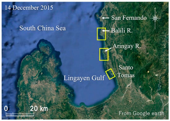When waves are obliquely incident to a slender water body at a large angle relative to the direction normal to the shoreline, shoreline undulation may develop owing to high-angle wave instability [1], resulting in the formation of sand spits. Serizawa et al. [2] predicted beach changes under the condition that waves were obliquely incident to the direction normal to the shoreline at an angle over 45° using the BG model (a model for predicting 3-D beach changes based on Bagnold’s concept) and showed that sand spits can develop by this instability mechanism. Although real examples of shoreline instability are limited in number because the wave incidence angle is ±20° at most on ordinary coasts, examples can be found in a slender water body. Since Lingayen Gulf in the Philippines is a slender bay, shoreline undulations caused by this instability mechanism occur downcoast of the river deltas, significantly affecting shore protection on the coast. Anthony et al. [3] described the formation of the sand spits associated with the Volta and Senegal River deltas, which show complex patterns of morphodynamic development while also strongly reflecting the recent impacts of human activities, such as the marked reduction in sand supply on the eastern coast of Ghana. In this study, the formation of the shoreline undulations downcoast of the river deltas of the Balili and Aringay Rivers was studied in the same manner using satellite images together with a field observation on 23 February 2018. The evolution of the shoreline undulation downcoast of the Aringay River delta was compared with the results of the numerical simulation using the BG model [4] on the formation of a sand spit at the point where an abrupt change of the shoreline configuration takes place. Furthermore, a sand spit at Santo Tomas located near the bottom of Lingayen Gulf was selected as another study site (Figure 1).
