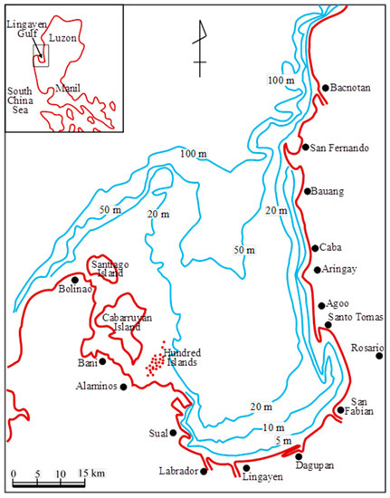 - MacManus, L.T.; Thia-Eng, C. The Coastal Environmental Profile of Lingayen Gulf, Philippine, Association of Southeast Asian Nations/United States Coastal Resources Management Project; Technical Publications Series 5; Association of Southeast Asian Nations: Manila, Philippines, 1990. [Google Scholar]