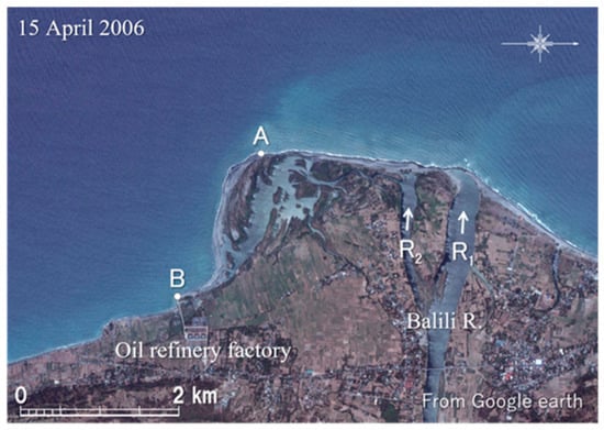 Figure 3 shows a satellite image of a rectangular area around the Balili River mouth, as shown in Figure 1, taken on 15 April 2006. In the lower Balili River, a minor distributary (R2) is separated from the main distributary (R1). In Figure 3, the Aringay River mouth was often closed by the elongation of a sandbar from the right bank, which was induced by the deposition of southward longshore sand transport. The shoreline extends straight southward in a 1.9 km stretch between the mouth of the distributary R2 and point A south of the mouth, and then the shoreline bends around point A at a right angle. The tip of the curved shoreline connects to point B at the jetty of the oil refinery factory with a wide lagoon landward of the barrier island. Thus, a slender wetland separated by a barrier island extended in the west–east direction south of the distributary R2.