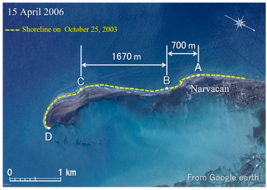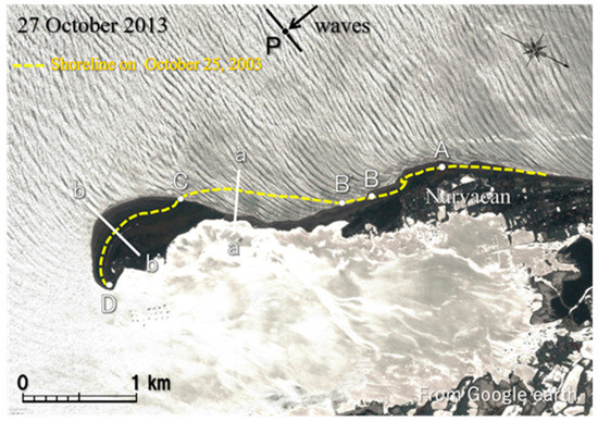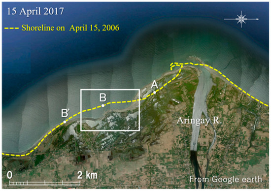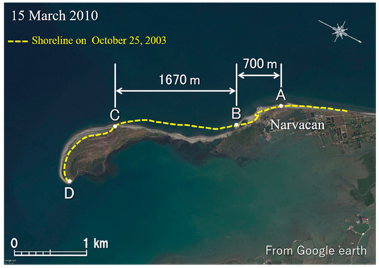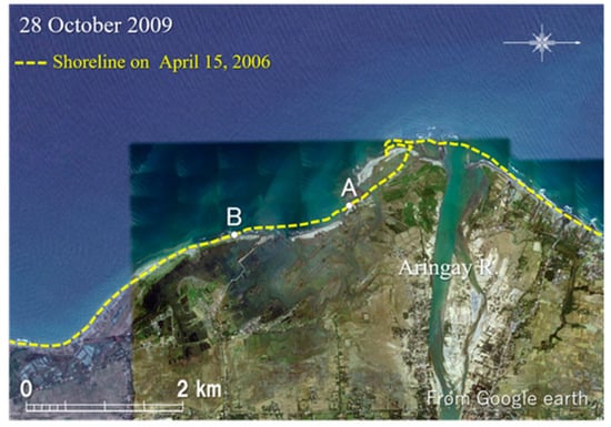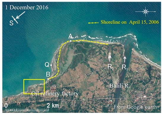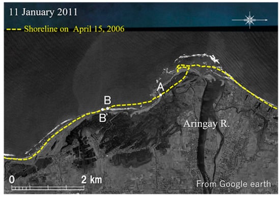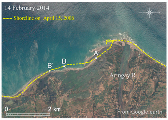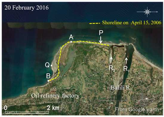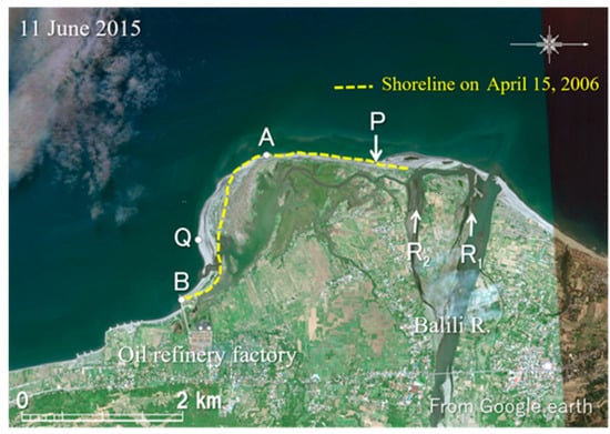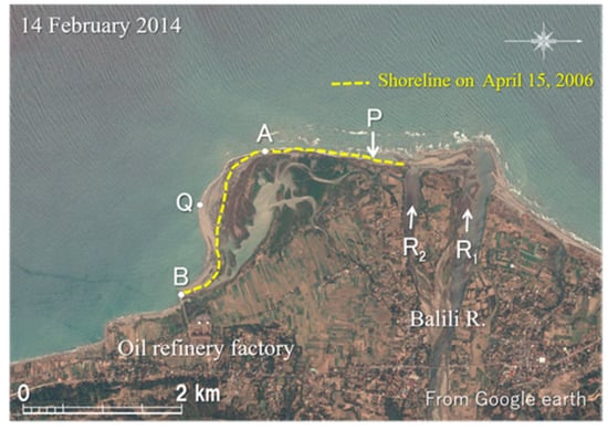 Similarly, Figure 4 shows a satellite image, taken on 14 February 2014, of the same area. Points A, B, P, and Q are indicated in Figure 4 to explain, but in what follows, “point” is omitted for simplicity, and the shoreline configuration measured on 15 April 2006 is shown in each figure. In this case, the shoreline position was directly determined from the satellite images while leaving an occurrence of some error in determining the shoreline position because of the lack of field data, i.e., the tide level and beach slope.