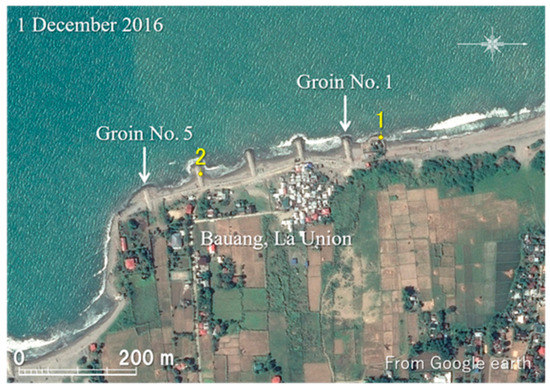 In the vicinity of point B south of the Aringay River, the shoreline upcoast of the groin was locally fixed, whereas the shoreline receded downcoast of the groins because of the blockage of longshore sand transport owing to the groins, as shown in Figure 18; an enlarged satellite image of the rectangular area shown in Figure 17.