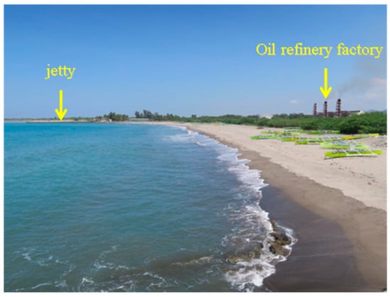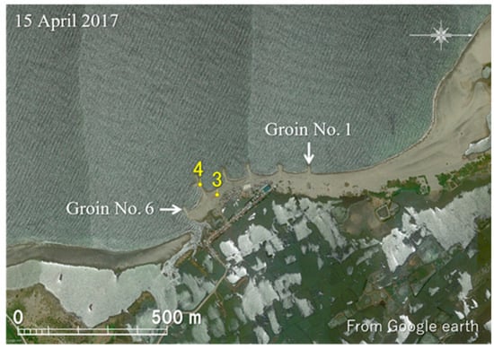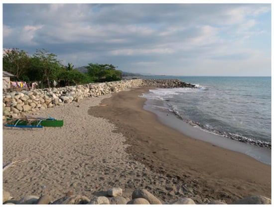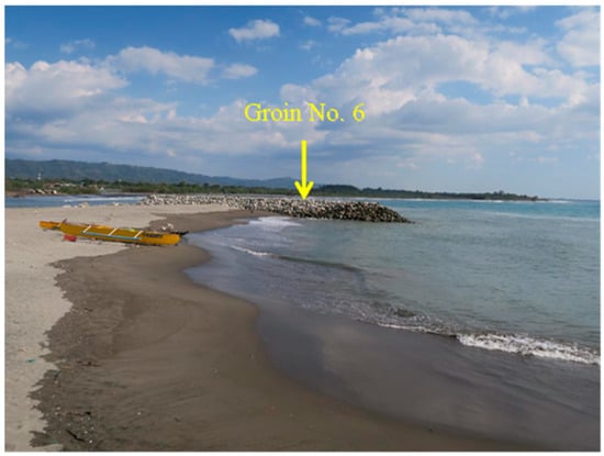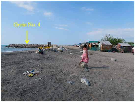In this area, six groins were installed to protect the village, whereas the shoreline markedly retreated south of groin No. 6. For example, the village houses between groins Nos. 4 and 5, made of large boulders with a crown height of 2 m above mean sea level, were protected by a sandy beach between groins, as shown in Figure 19. Similarly, the intertidal beach was left north of groin No. 6.