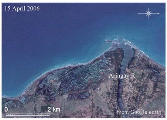 Figure 11 shows a satellite image of the rectangular area enclosing the Aringay River delta, taken on 15 April 2006. Here, a slender sandbar extended southward from the north riverbank, closing the river mouth. A sandy beach continuously extended southward while enclosing a lagoon behind it. Furthermore, a slender sand spit of 308 m length elongated southward from the south end of the river mouth sandbar. The elongation direction of the sand spit was at a large angle of 43° relative to the direction normal to the coastline immediately south of the river mouth. In the following figures, the shoreline configuration measured on 15 April 2006, as shown in Figure 11, is drawn for comparison.
