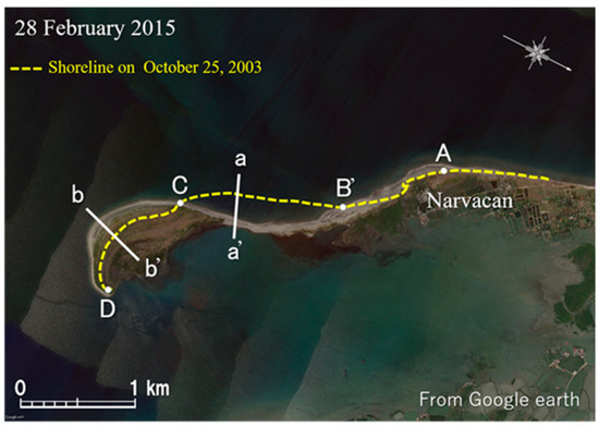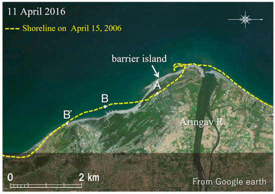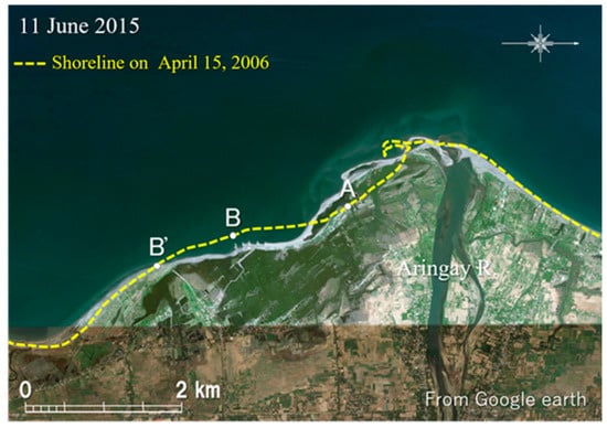 By 11 June 2015, A located at the north end of the erosion zone in 2009 was enclosed by a slender barrier island with the elongation of a sand spit (Figure 15). Simultaneously, the erosion area expanded up to B’ located 1030 m south of B until this year. Even though the erosion expanded over time, the shoreline recession was relatively small near B because of the construction of five stone groins of 80 m in length in its vicinity. These groins prevented the shoreline from receding locally but caused downcoast erosion.