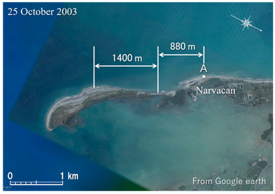 When setting A at the protruded shoreline in front of Narvacan, a concave shoreline is present near the location 880 m southeast of A, and then the shoreline protrudes again at a location 1400 m southeast of A. Since the shoreline undulation was not so large in 2003, the sand spit was considered to have been simply extending, owing to the continuous sand supply by southward longshore sand transport. However, 19 groins had been constructed until 25 October 2003, north of Narvacan, and continuous sand supply to the tip of the sand spit gradually became difficult.