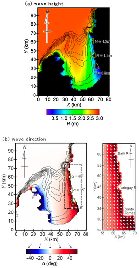 The wave angle relative to the direction normal to the coastline is over 45° at any point, taking the direction of the coastline into account. Similar results when Smax is 25 are shown in Figure 27. The reduction of the wave height from the entrance of the gulf toward the bottom of the gulf is the same as that when Smax is 75, with H = 1.37 m around the Balili River and H = 1.1 m near the sand spit at Santo Tomas. Comparing the two results highlights that the wave height along the coastline is greater when Smax is 75 than that when Smax is 25 because of the concentration of wave propagation. The wave angle relative to the direction normal to the coastline is greater than or close to 45° at any point. When the angle between the direction normal to the shoreline and the wave direction exceeds 45° at a point along the shoreline, the shoreline protrusion occurs at such a point owing to high-angle wave instability [1,2,12]. Thus, shoreline undulations or sand spits are capable of forming along the east coastline in Lingayen Gulf.