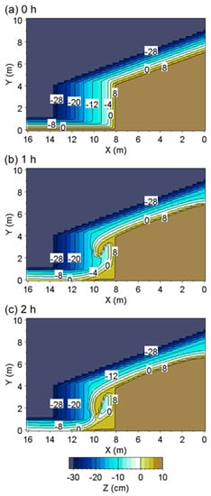 A sand spit has formed at a location with an abrupt change in shoreline configuration south of the Balili River delta, enclosing a lagoon behind the sand spit, as shown in Figure 3. Such a formation of a sand spit can be numerically predicted using the BG model [4,12]. San-nami et al. [4] carried out a numerical simulation of the elongation of a sand spit with a model case of 1/100 on a seabed with different water depths and slopes around the location where the shoreline configuration abruptly changes. In their study, the water depth where a sand spit is formed were altered to 5, 10, 15, and 20 cm at various seabed slopes of 1/50, 1/40, 1/30, and 1/20. The incident wave height was Hi = 4.6 cm, and the wave period T = 1.27 s. A beach model was produced, as shown in Figure 28a, with incident waves from the Y-axis, so the wave incidence angle normal to the upcoast shoreline was to be 20°. The depth of closure was given as hc = 2.5 H, where H is the wave height at a point. The berm height and equilibrium slope of sand were assumed as 5 cm and 1/5, respectively, based on the experimental results along with the angle of repose of sand of 1/2. The calculation domain was discretized by meshes of 20 cm, and the 8 h of calculation (8 × 104 steps) was carried out using the time intervals of Δt = 10−4 h. Table 2 shows the calculation conditions.