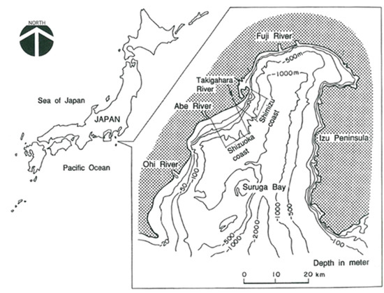 The beach changes along the east coast in Lingayen Gulf could be compared with those measured in another bay with a similar aspect ratio and wave characteristics, such as Suruga Bay in Japan, shown in Figure 29. When a straight line is drawn between Point Irozaki at the tip of Izu Peninsula and Point Omaezaki in Figure 29, the width of the bay mouth is approximately 50 km, and the length of the bay measured from this straight line to the bottom of the bay is 60 km, resulting in an aspect ratio of 1.2. Since the width and length of Lingayen Gulf were 44 and 58 km, respectively, and the aspect ratio is 1.3, both bays are similar to each other in terms of width, length, and aspect ratio. In addition, the west coast of Lingayen Gulf has a complicated coastline with many islands and headlands, similarly to the east coast in Suruga Bay. The development of the Balili and Aringay River deltas along the east coast of Lingayen Gulf is similar to the development of the river deltas around the Ohi and Abe Rivers with the catchment areas of 1280 and 567 km2, respectively, on the west coast in Suruga Bay. Furthermore, the formation of a sand spit at Santo Tomas is similar to the formation of the Mihono-matsubara sand spit. Thus, the morphologies of both bays resemble each other so that waves are obliquely incident to the direction normal to the shoreline, and a sand spit has been formed near the bay bottom. Therefore, much experience of beach erosion along the west coast in Suruga Bay is useful in considering measures against beach erosion on the east coasts in Lingayen Gulf.