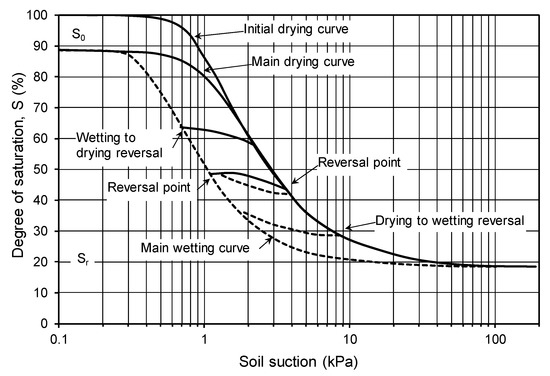 The soil–water characteristic curve is a family of drying and wetting curves that can be written in terms of various designations for the amount of water in the soils (e.g., gravimetric water content, volumetric water content, and degree of saturation). A typical family of soil–water characteristic curves [2,3] is shown in Figure 1.