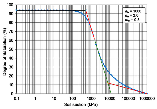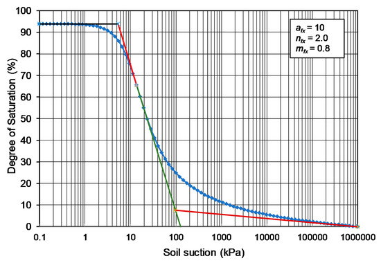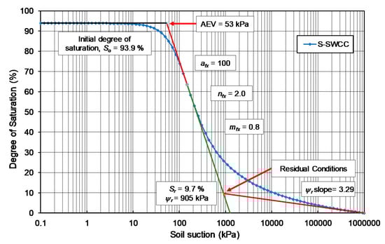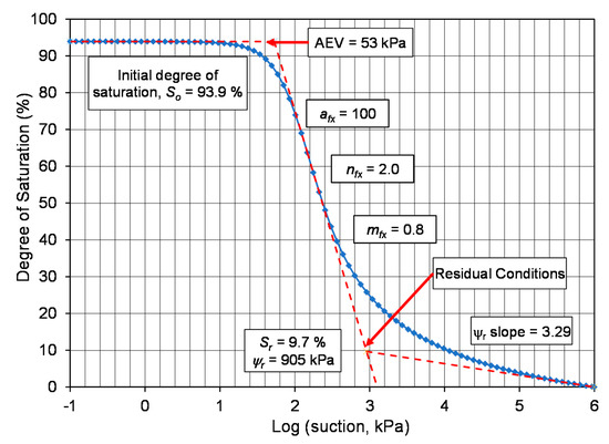 The Fredlund and Xing (1994) equation [25] for the soil–water characteristic curve was used to represent the drying degree of saturation SWCC over the entire range of soil suction. There were three fitting parameters associated with the Fredlund and Xing (1994) equation [25], namely, afx, nfx, and mfx. The initial degree of saturation (So) also needed to be calculated external to the fitting process (See Equation (3) and the illustration of variables in Figure 2).