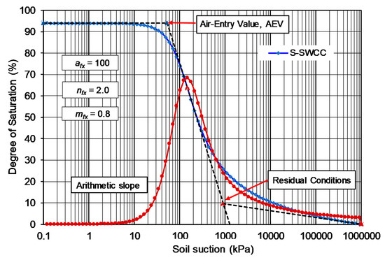 The reference example, shown in Figure 4, was first studied for the following SWCC fitting parameters; namely, afx = 100, nfx = 2.0, and mfx = 0.8. An approximate residual suction value was estimated to be 1000 kPa. The air-entry value (AEV) was calculated to be 53.14 as the intersection point between the horizontal line and the line through the inflection point. A more accurate value for the residual suction can be calculated following the generation of the S-SWCC. The more precise calculation of residual conditions gave a residual suction (ψr) equal to 904.9 kPa and a residual degree of saturation (Sr) equal to 9.68%.