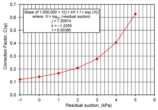 Differentiating the correction factor function (C(ψr)) with respect to suction yielded fixed values for the derivative of the function with respect to suction, as shown in Figure 6. The following empirical equation (i.e., Equation (7)) fits the values for the slope of the C(ψr) function.