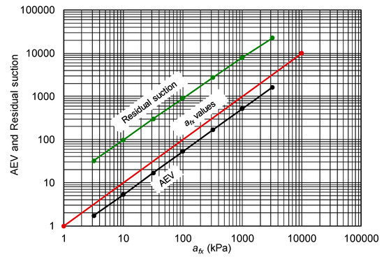 The AEV of a soil was always somewhat smaller than the suction at the inflection point, as shown in Figure 7. The difference between the AEV and the afx variable was influenced by the nfx parameter. Smaller nfx values resulted in a larger difference between the afx parameter and the AEV. Figure 7 is shown for a nfx value of 2 and a nfx value of 0.8. It can be observed that a nfx value of 2 resulted in approximately one order of magnitude difference between the inflection point and residual suction values. The 1:1 equality line in Figure 8 represents the afx value. Changing the nfx value and the mfx value changed the spread between the AEV and the residual suction.