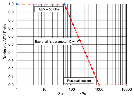 The parameter (ζ) for the total cohesion calculation [16] is introduced as the slope of the unsaturated shear strength. When the suction is lower than AEV, the ζ parameter is 1.0. As suction increases, the ζ parameter decreases and goes to zero at residual suction. The shear strength at the AEV (τAEV) can be calculated as follows: