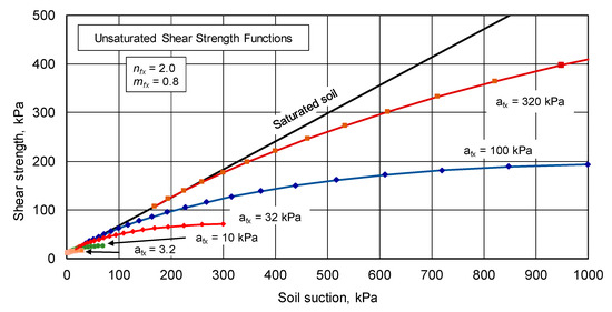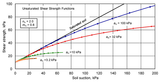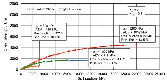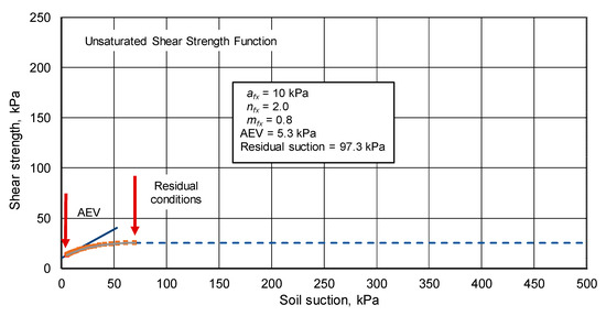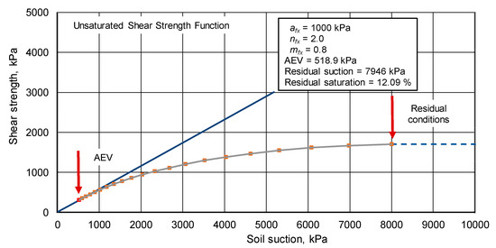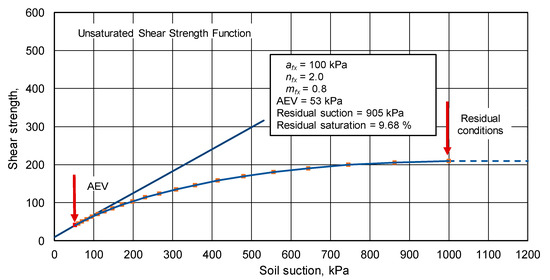 Rassam and Cook (2002) [21] and Vilar (2006) [22] suggested the use of a hyperbolic function for the shear strength function, starting from the air-entry value of the soil. It was noted that the shear strength became essentially constant at residual suction conditions and suggested that the shear strength be measured in this region and be used as a reference (or anchor point) value for the shear strength function. The soil tested had an AEV of 30 kPa and a residual suction of approximately 700 kPa.