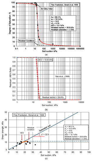 In this study, it was assumed that the AEV and residual suction (ψr) formed two anchor points on the degree of saturation SWCC (S-SWCC). These anchor points were used in conjunction with the Bao et al. (1998) [16] empirical relationship for the estimation of the unsaturated shear strength function.