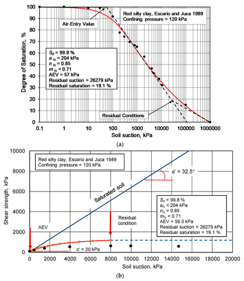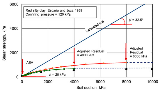 Escario and Juca (1989) performed SWCCs and shear strength tests on Red clay of Guadalix de la Sierra [28]. The specimens were compacted and tested in a modified direct shear apparatus. The Guadalix Red silty clay was tested using a confining pressure of 120 kPa [24]. Figure 20 shows the SWCC and shear strength test results for specimens of the silty clay using the adjusted residual suction of 8000 kPa. The AEV was measured to be approximately 57 kPa. The residual suction was estimated to be around 26,279 kPa using the construction procedure proposed by Vanapalli et al. (1996) [7]. The effective angle of internal friction was measured to be 32.5 degrees and the cohesion intercept was 20 kPa.