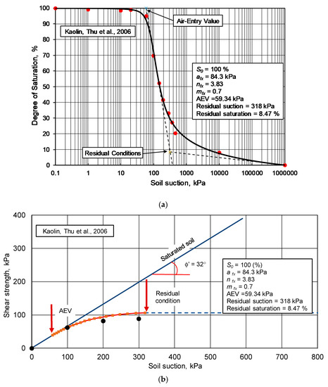 Thu, Rahardjo, and Leong (2006) presented degree of saturation SWCC results, along with shear strength results, for a compacted kaolin soil [23]. The best-fit parameters for the S-SWCC when using the Fredlund and Xing (1994) equation [25] were as follows: afx = 130 kPa, nfx = 2.2, mfx = 1.5, and a residual suction of 400 kPa. The calculated AEV was 60 kPa.