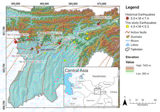 - Nazarov, A.G.; Nechaev, V.A. Seismic Microzonation Map—The Administrative Area of Stalinabad; Academy Science, USSR: Dushanbe, Tajikistan, 1953; p. 15. (In Russian) [Google Scholar]